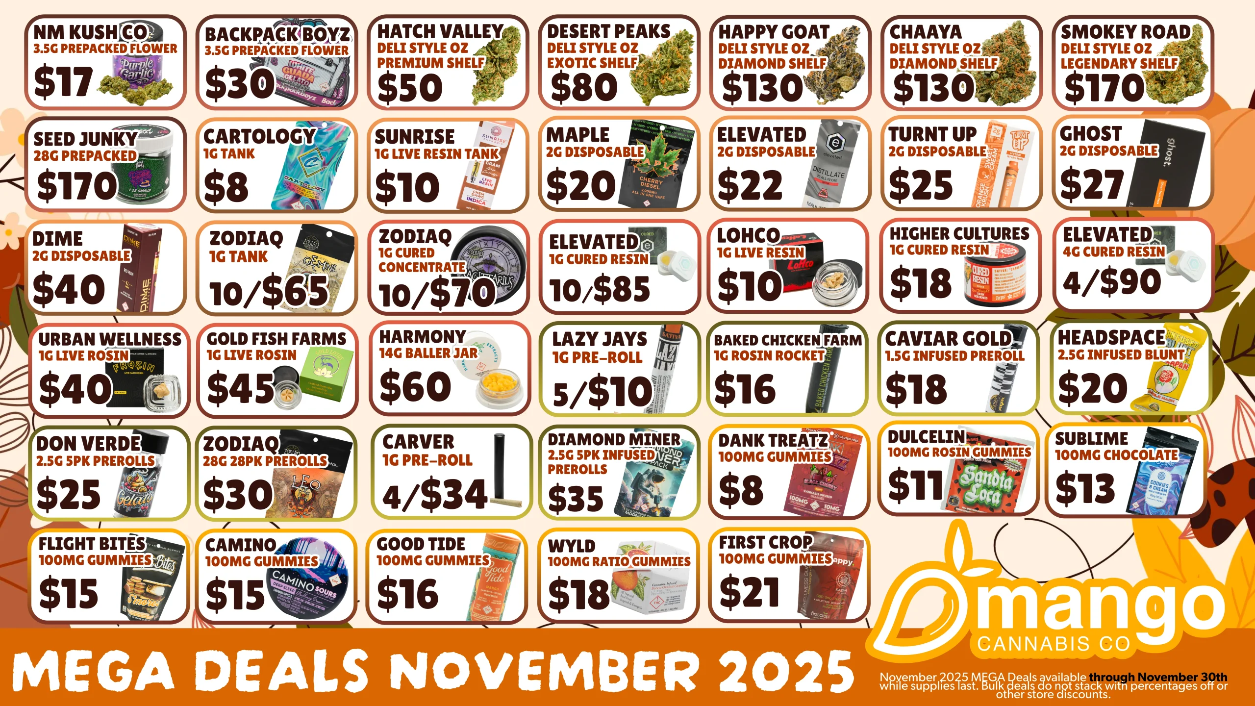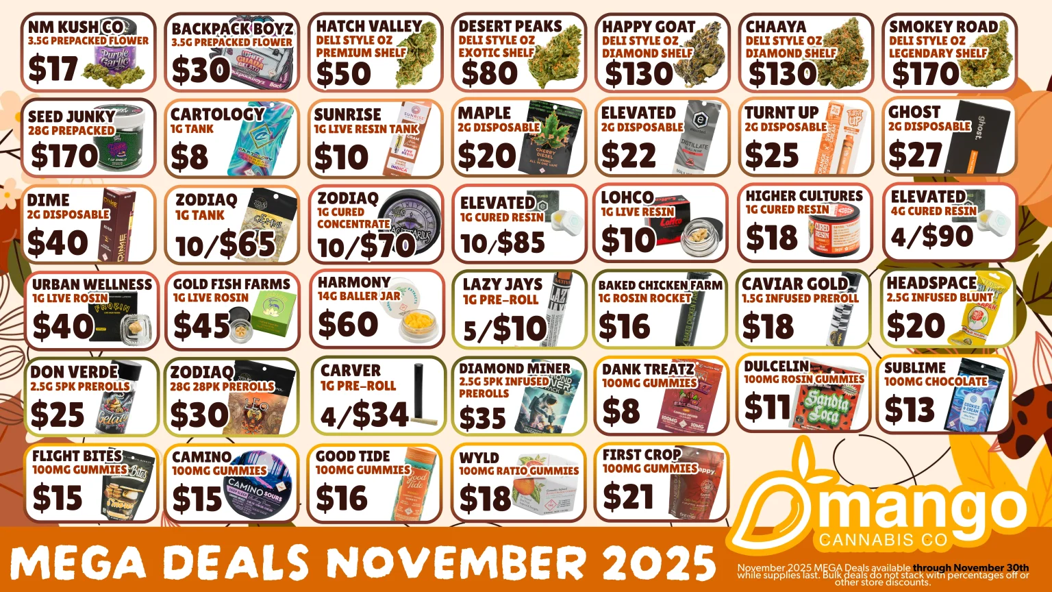 Q: What are the best Sunland Park dispensary deals at Mango Cannabis? A: Our Sunland Park dispensary deals are unmatched! We offer daily specials, first-time customer discounts, and bulk purchase savings. Check our online menu for today’s deals on flower, edibles, and concentrates. The Mango Superstore McNutt Road location regularly features discounts on popular strains like GMO Cookies and Blue Dream. Sign up for our newsletter to get exclusive Sunland Park dispensary deals delivered to your inbox.